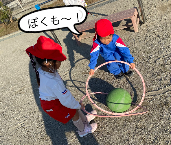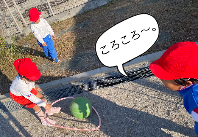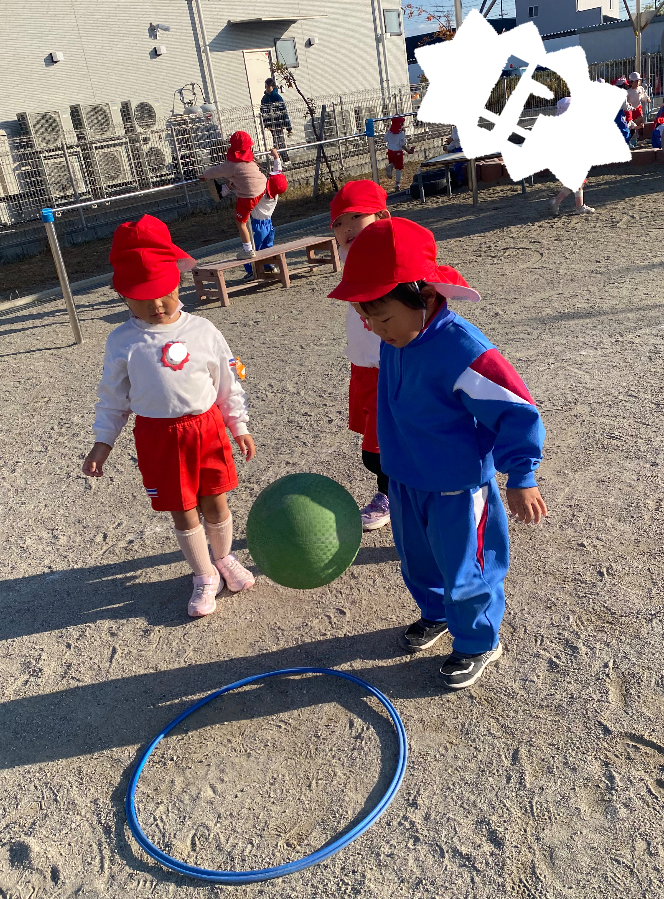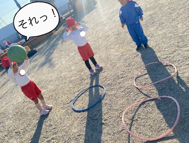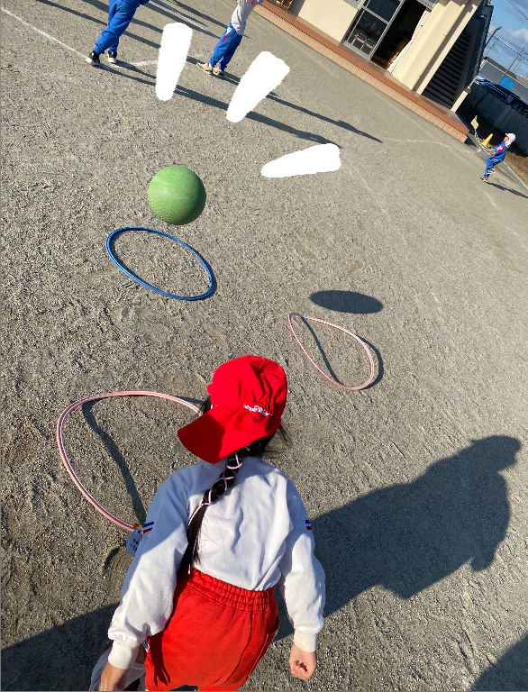 外遊びでの年少さん!フラフープを地面に置いて何をしてるのかな?と思ったらどうやら的当てのようにして遊んでいました!