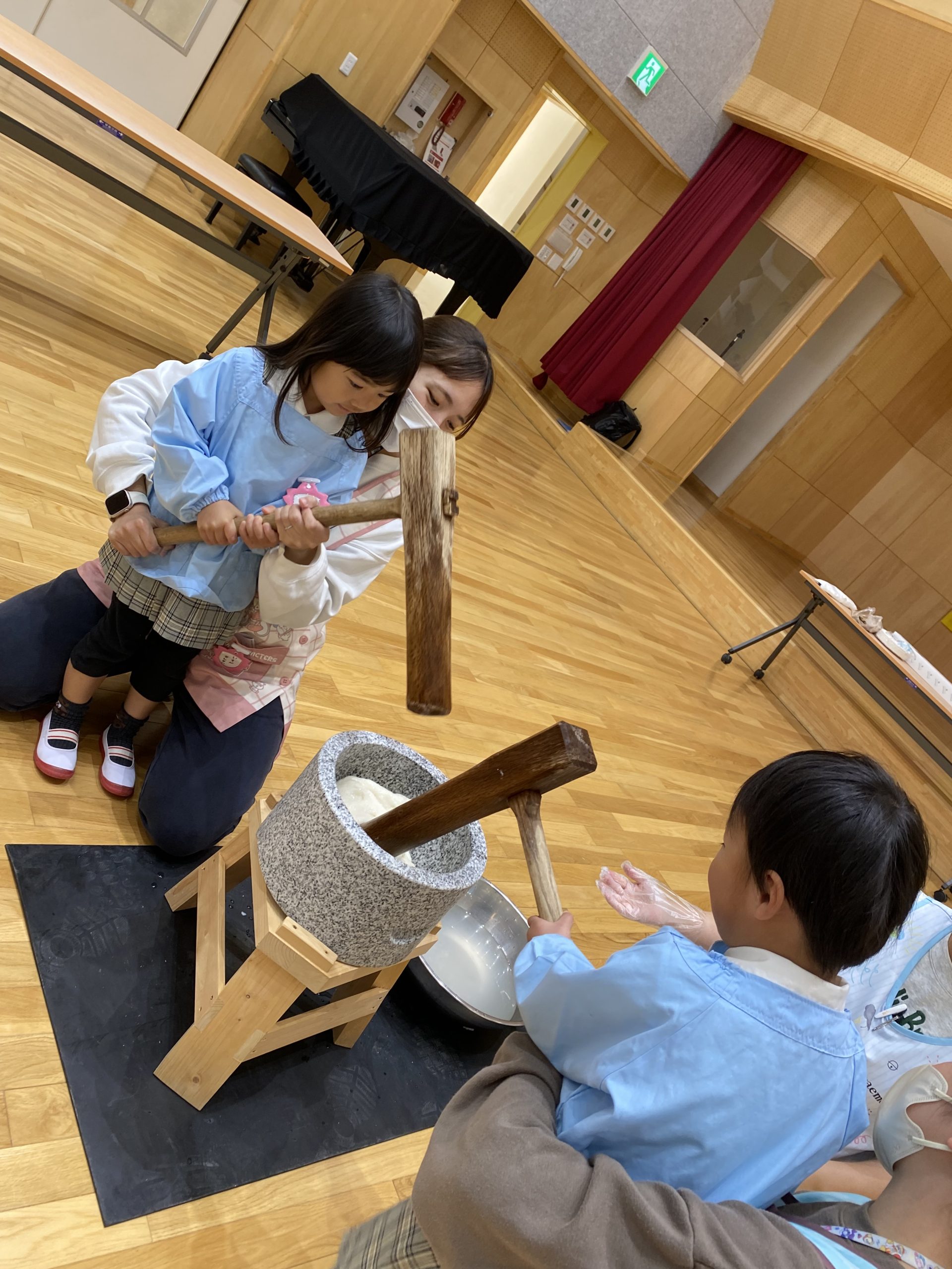 つぼみぐみとばらぐみは小さいサイズの臼と杵を使って先生と一緒にぺったんこ!