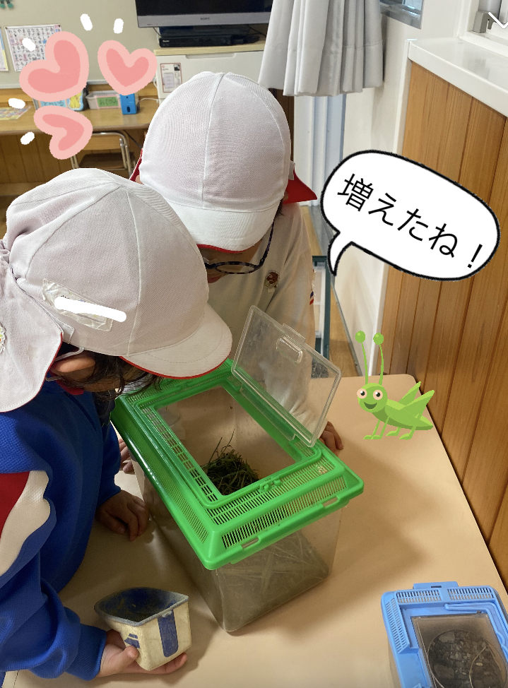 道中バッタが逃げ出さないか心配でしたが無事に虫かごの中へ♡