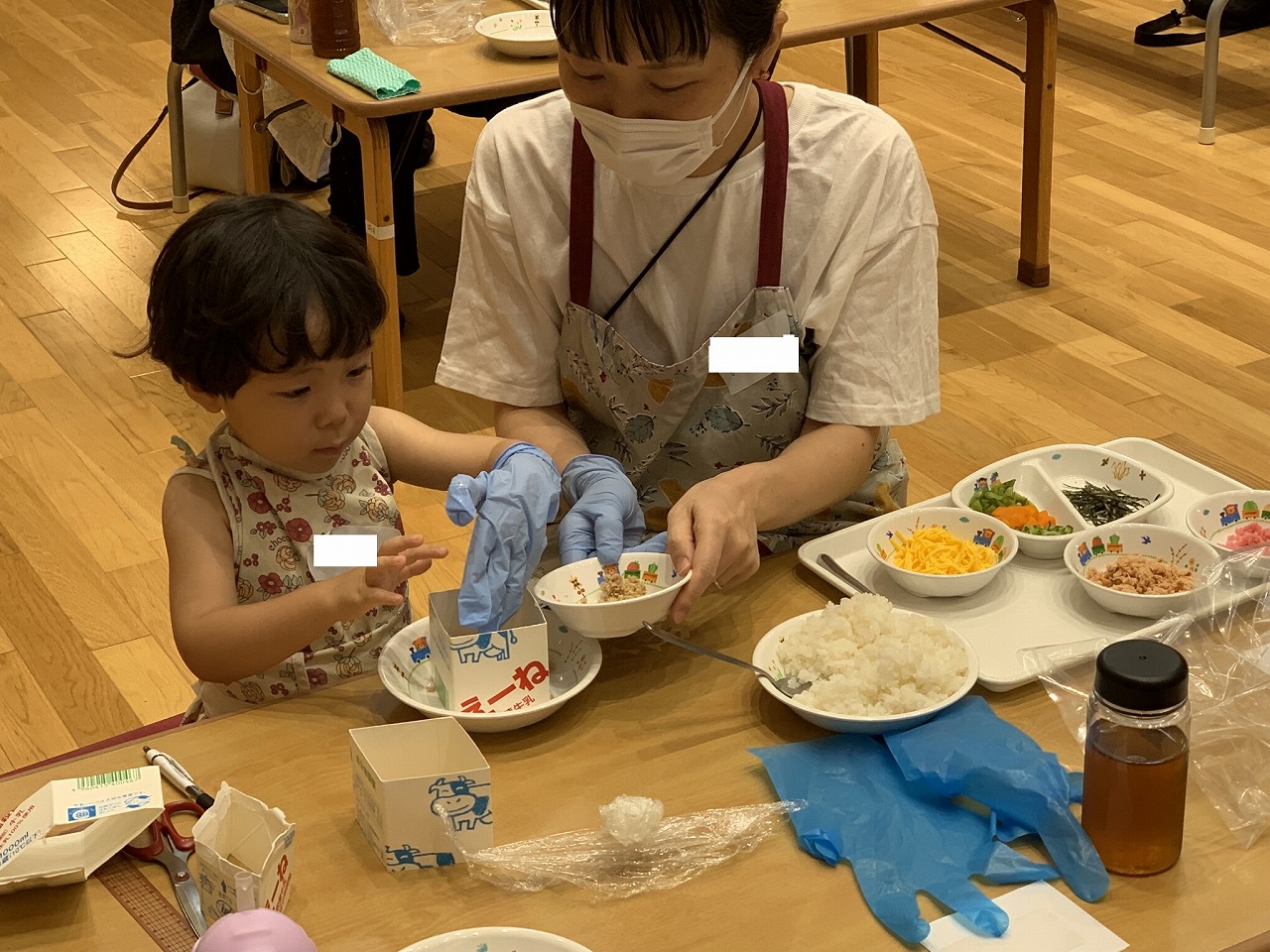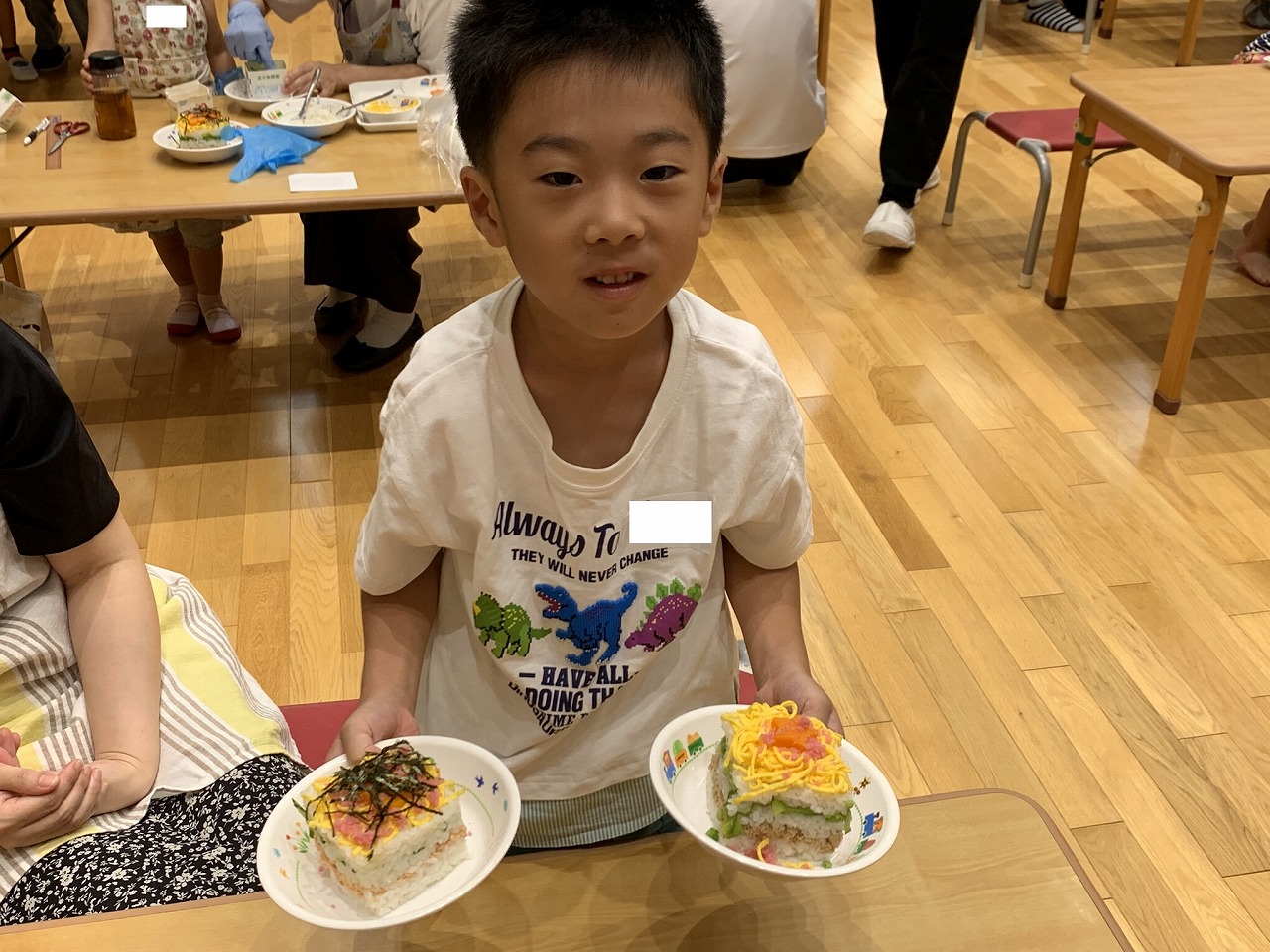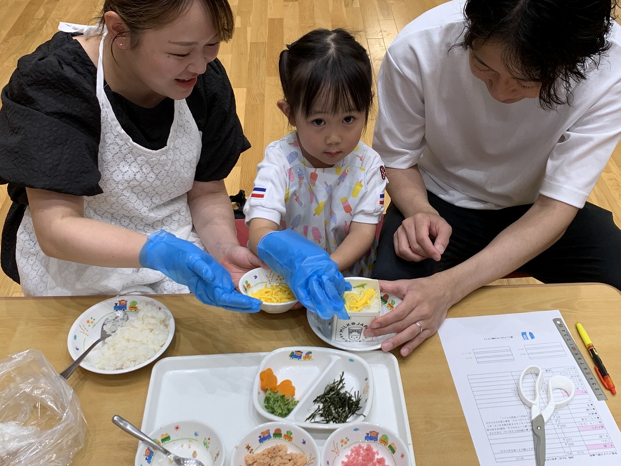 つぼみ組のお子様からすみれ組のお子様まで、親子で一緒にお寿司を作り、