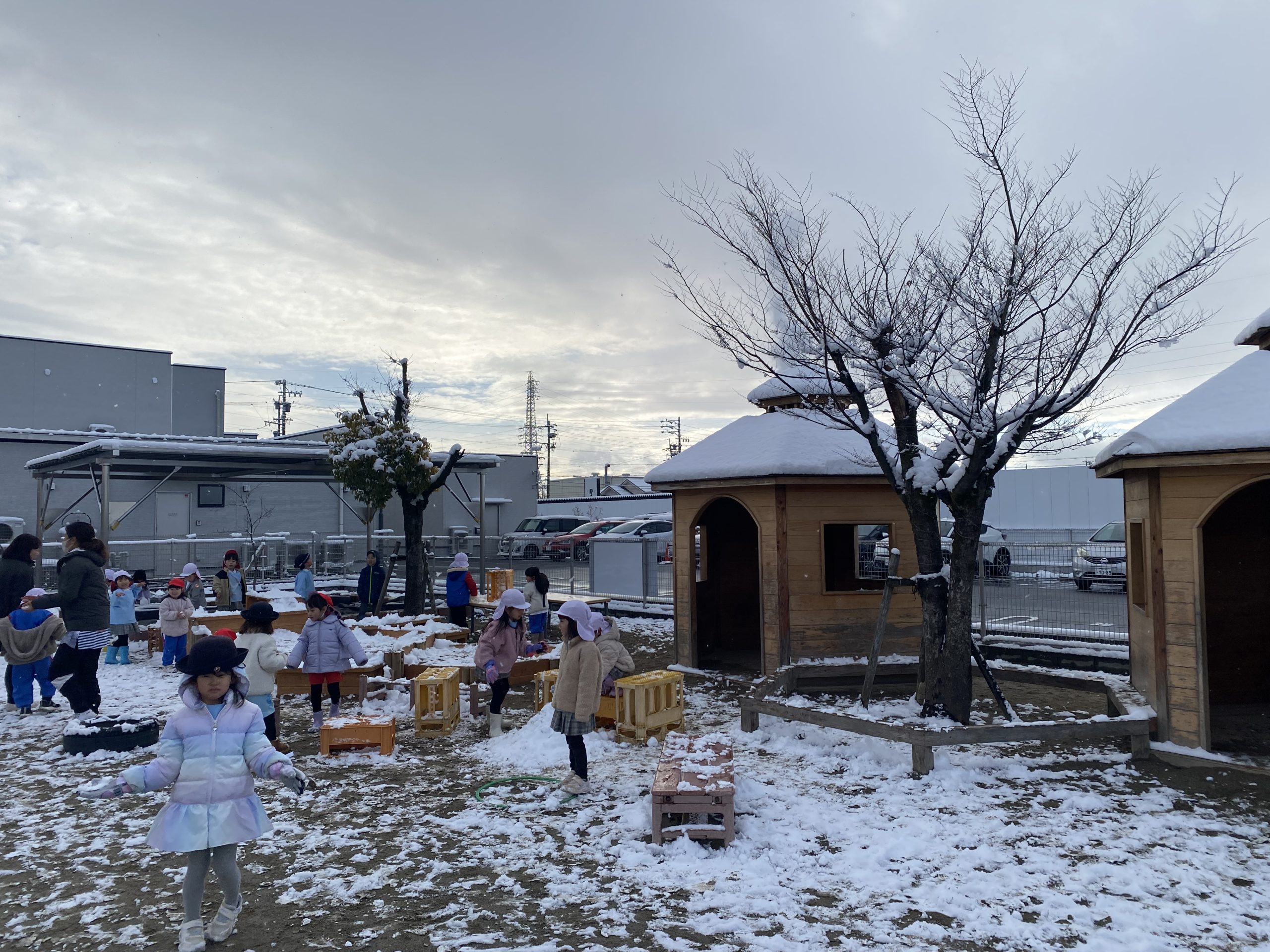 昨夜から降った雪が積もり今朝は園庭が真っ白に…。