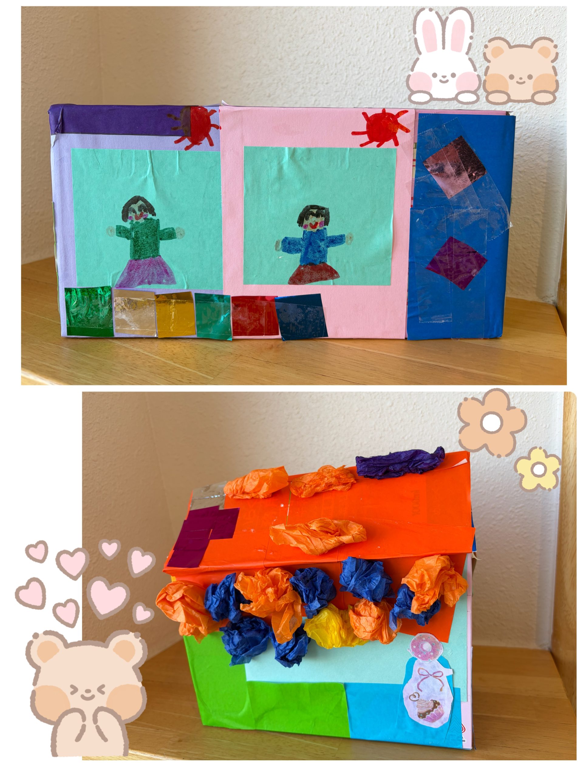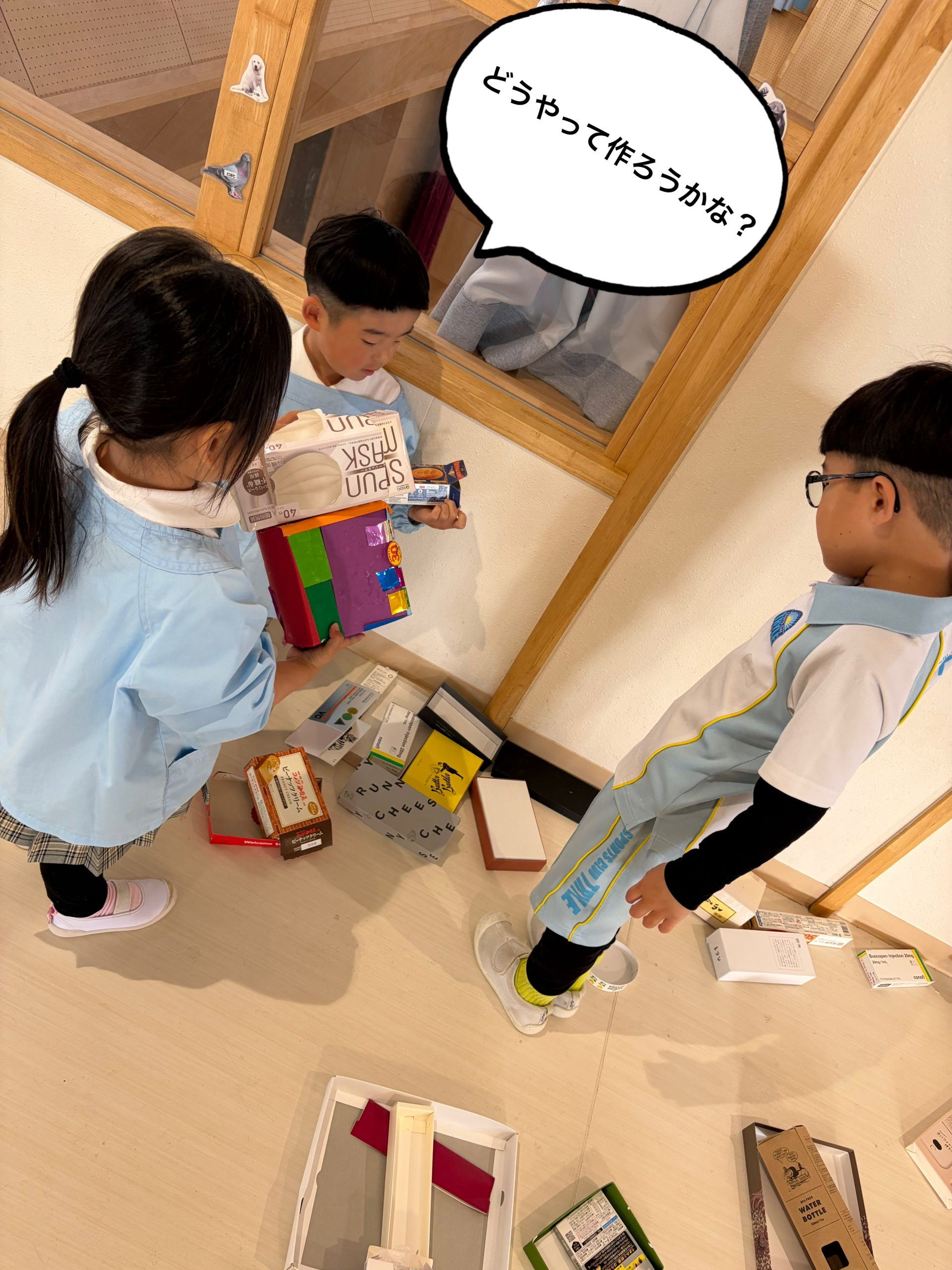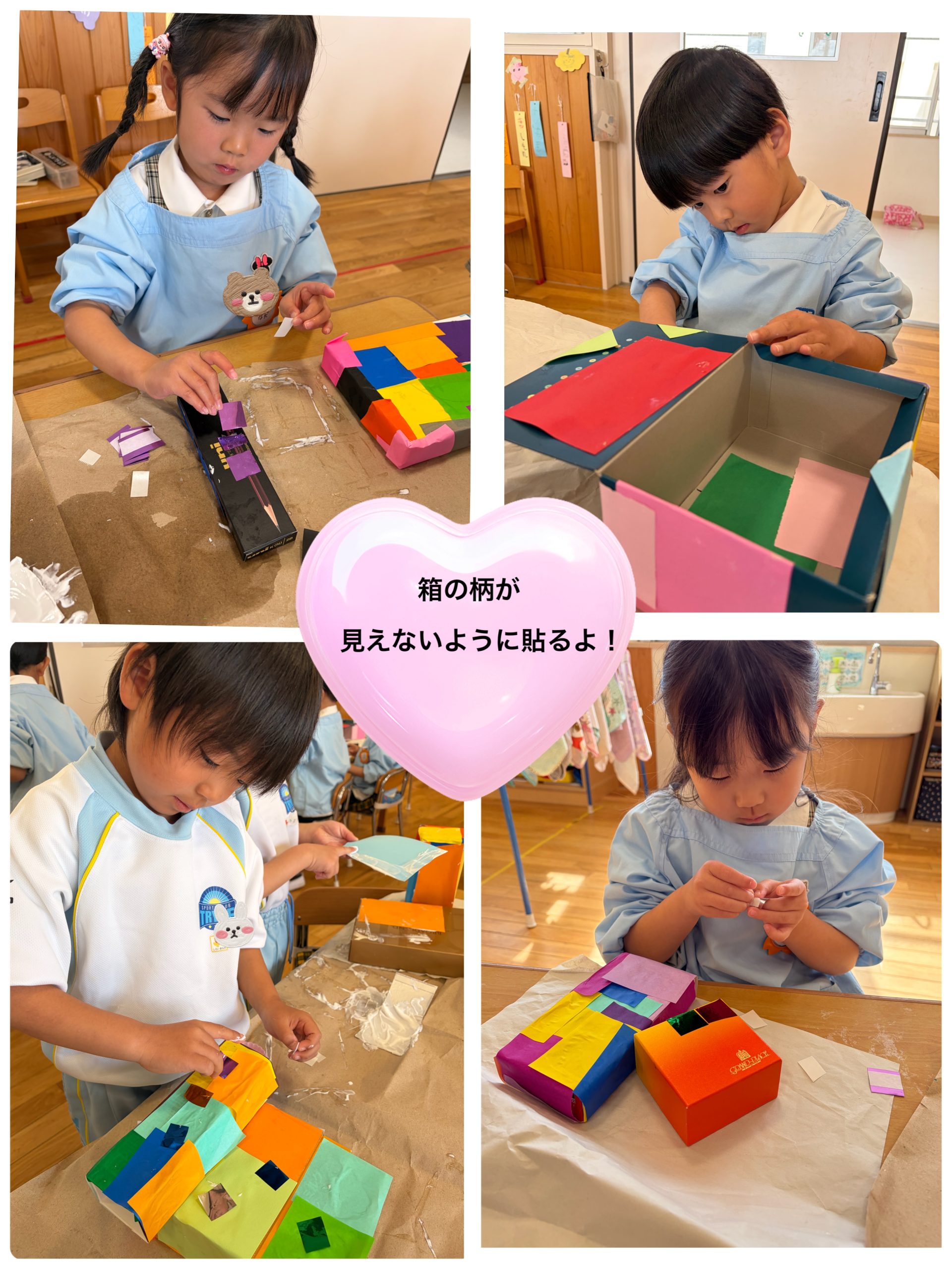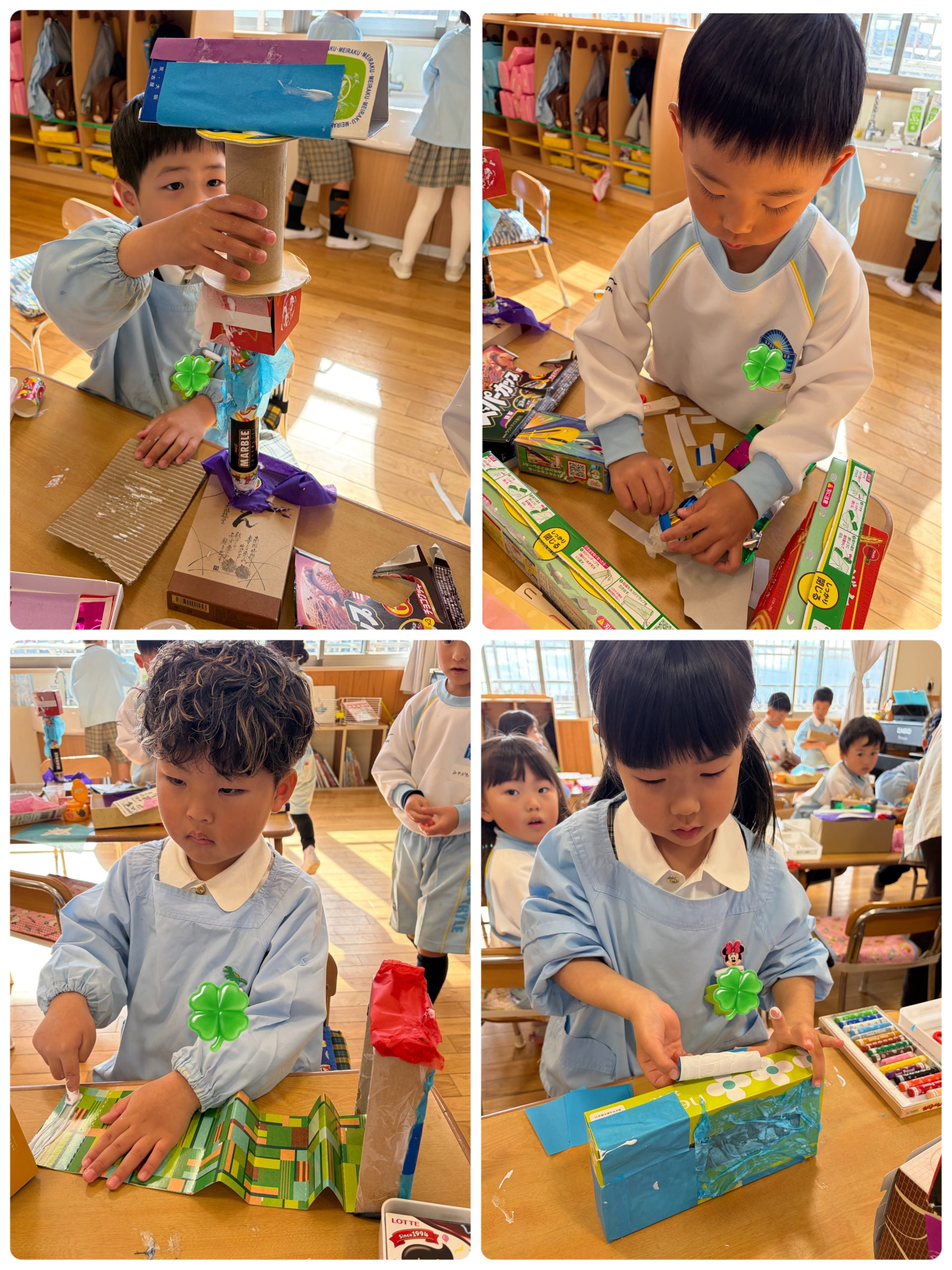 今までは自分達が作りたい物を好きな様に作っていた為、貼り合わせるだけで完成と言う子が多かったです。なので次のステップとして今回からはテーマを決めたり、箱に折り紙や画用紙を貼り箱を見えなくするなど少しレベルアップをしてみました!