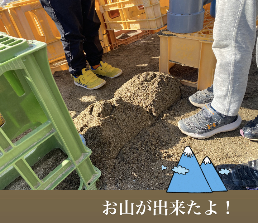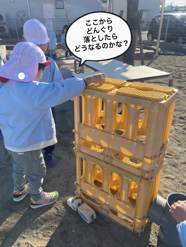 上から砂を流し込み、どうするのかな?と見守っていると1人の子が「どけてみよう!」とビールケースを動かすと…